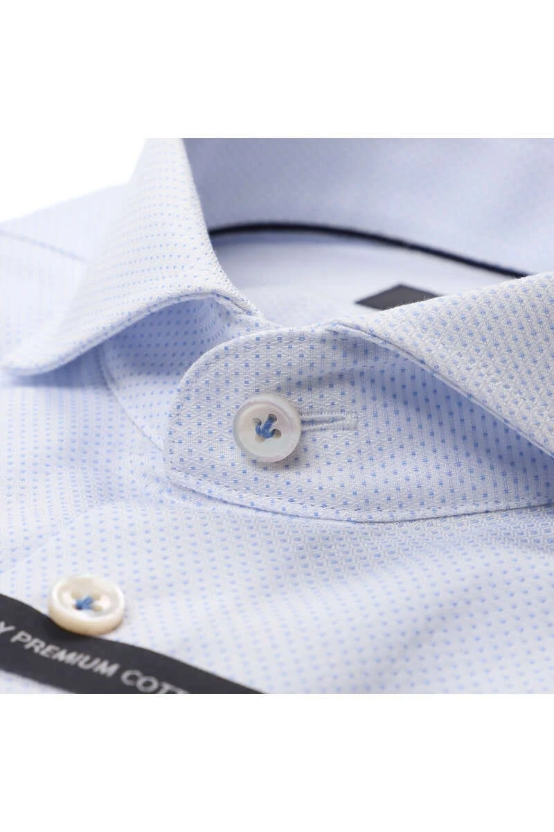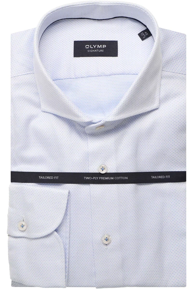 Ein tolles OLYMP SIGNATURE Tailored Fit Hemd, in der Farbe hellblau – Gemustert. Der Kragen ist ein Haifischkragen und das Shirt ist aus einem edlen Struktur-Gewebe aus 100% Baumwolle.